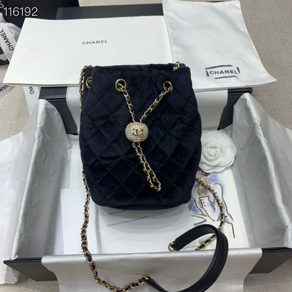 Chanel Drawstring Bucket Bag With Crystal Chain With CC Details On Strap Bag 20cm Gold Hardware Velvet/Lambskin Leather Spring/Summer 2020 Collection