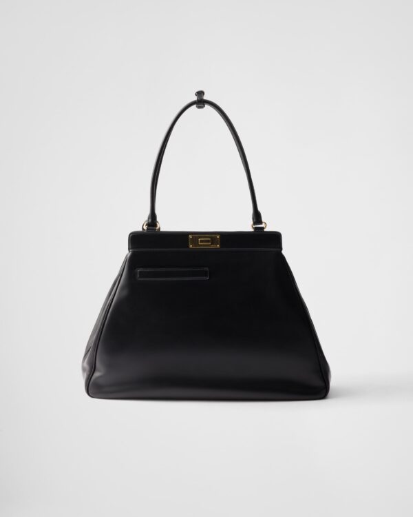 Geometric lines and oversized volumes design the silhouette of this sophisticated leather bag. The roomy design plays with the concept of illusion and double, expressed by details replicated on both the front and back, like the refined turn-lock clasp taken from Prada archives.