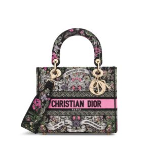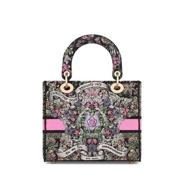 The Lady D-Lite bag combines classic elegance with House modernity. The black style is fully embroidered with the multicolor Dior Around the World motif by Pietro Ruffo, showcasing a star decorated with flowers in honor of Scottish heritage, the collection’s hallmark theme, and an allegory of the senses with a Mary Stuart quote: ‘En ma fin est mon commencement’ (In my end is my beginning). The Christian Dior Paris signature adorns the front, while pale gold-finish metal D.I.O.R. charms enhance and illuminate its silhouette. Equipped with a wide, removable embroidered strap, the medium Lady D-Lite bag can be carried by hand or worn crossbody, and it will coordinate with the season’s other Dior Around the World creations.
