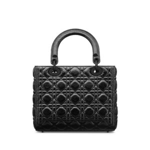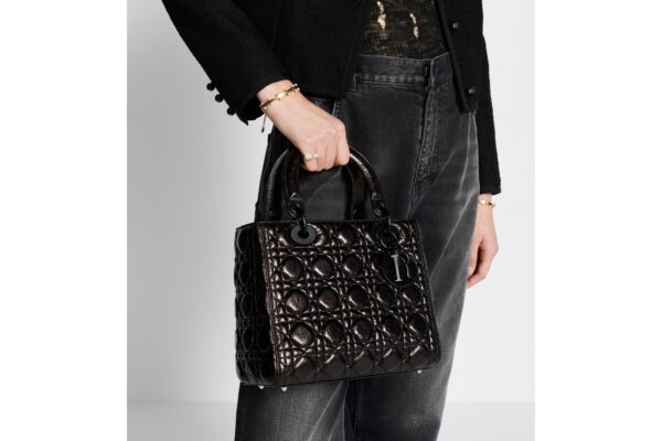 The Lady Dior bag embodies Dior’s vision of elegance and beauty. The refined, timeless style is made in black crinkled calfskin with Cannage stitching, creating an instantly recognizable quilted texture. Ultra-matte metal D.I.O.R. charms offer a modern touch. Featuring a thin, removable leather shoulder strap, the medium Lady Dior bag can be carried by hand or worn crossbody.