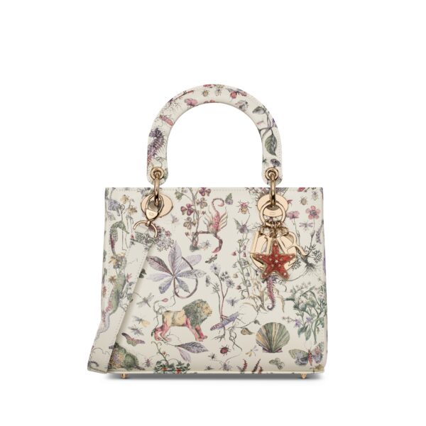 The Lady Dior bag epitomizes the House’s vision of elegance and beauty. Sleek and refined, the timeless style is crafted in latte calfskin printed with the multicolor Dior Cabinet de Curiosités motif by Pietro Ruffo, showcasing a multitude of colorful animals within a floral design. Pale gold-finish metal D.I.O.R. charms enhance its silhouette. Equipped with a thin, removable leather strap, the medium Lady Dior bag can be carried by hand or worn crossbody, and it will complement the season’s other Dior Cabinet de Curiosités creations.