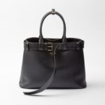 The eclectic and modern essence of the Prada Buckle bag is rediscovered in a new bucket silhouette with a sleek shape. Bold contrasts brighten the soft design, embellished with a studded belt with a punk aesthetic that adds an unexpected, contemporary touch.