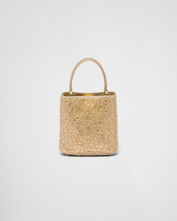 The elegant design of the Prada Panier bag is emphasized by luminous all-over crystals that recall the jewelry world. The bag has a detachable shoulder strap and an exclusive name tag with metal logo.