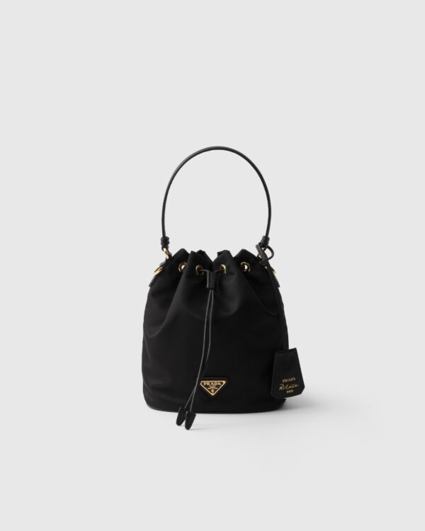 This mini-bag made of Re-Nylon with a bucket silhouette is a Re-Edition of an archive style. The accessory, worn as a handbag or with a detachable shoulder strap, is enriched with leather details, while the enameled metal triangle logo completes it with its iconic signature touch.