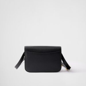 This shoulder bag plays with the concept of simplicity in its lines and compact size, combining versatility and elegance in a refined design. The bag made of Saffiano leather comes with an adjustable shoulder strap enriched with metal hardware, like the iconic triangle logo embellishing the clasp.