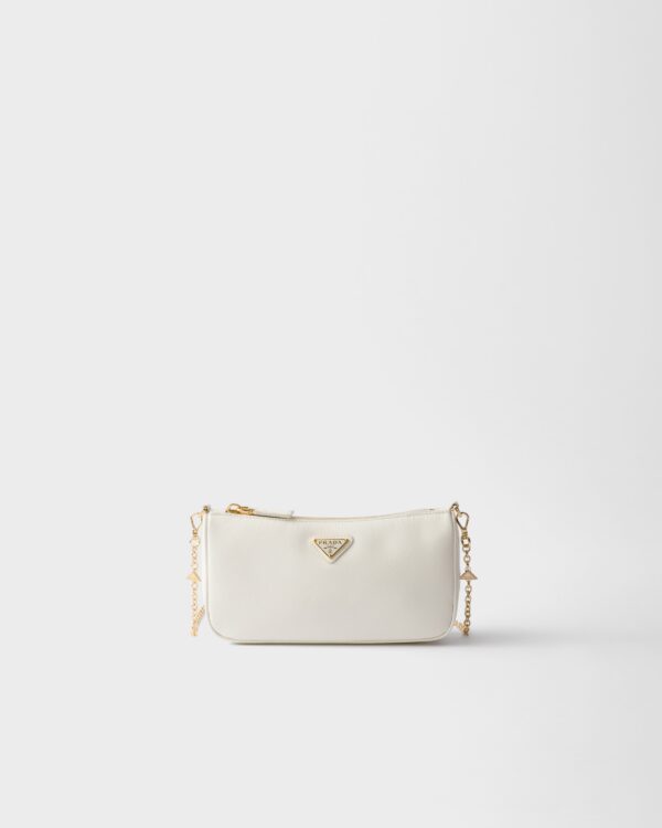 This mini bag combines Prada’s emblematic codes in a sophisticated, timeless design. The Saffiano leather accessory completed with a chain shoulder strap is decorated with the enameled metal triangle logo.